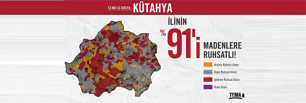 TEMA Vakfı’nın çalışmalarına göre 24 il yaklaşık 20 bin maden ruhsatına bölünmüş durumda. Ruhsatların büyük bölümünü ihale edilmeyi bekleyen ruhsatlar (14.967) oluştururken, ihale ruhsatlarını 2.158 ruhsat ile işletme ruhsatları; 1.871 ruhsat ile arama safhasındaki ruhsatlar oluşturuyor. İşletme safhasındaki ruhsatların en yoğun olduğu yerleri, Muğla, Sivas ve Kaz Dağları Yöresi’nin Çanakkale-Balıkesir illeri oluşturuyor. Her an hayata geçirilebilecek bu ruhsatlar, özellikle bu illerde madencilik faaliyetleri özelinde ciddi bir tehdit olduğunu ortaya koyuyor. Arama ruhsatları ise Siirt- Şırnak-Batman, Eskişehir ve yine Çanakkale-Balıkesir illerinde yoğunlaşıyor. Yine TEMA Vakfı’nın çalışmasına göre ruhsatların en yoğun olduğu il, %92’si madenlere ruhsatlı olan Kütahya. Kütahya’yı, Çanakkale-Balıkesir (%79) ve Uşak(%80) illeri izliyor.